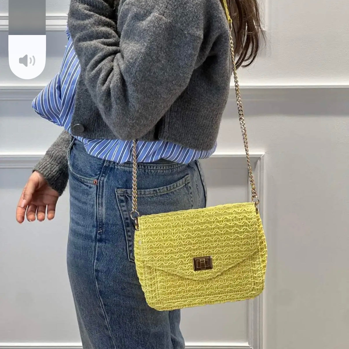 Bandoulière : Mixte chaîne dorée et empiècement paille.